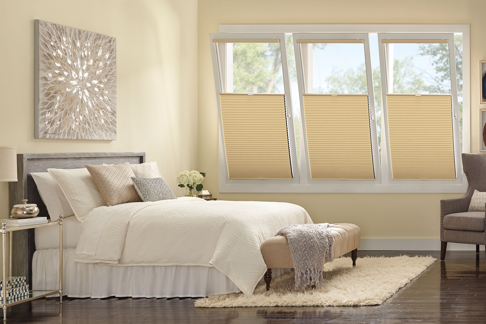 In both the open-plan living space and the master bedroom, the combination of Luxaflex® Duette® Shades and sheer Luxaflex® Curtains allowed Neale to create an interesting interior look, while balancing style and functionality.
