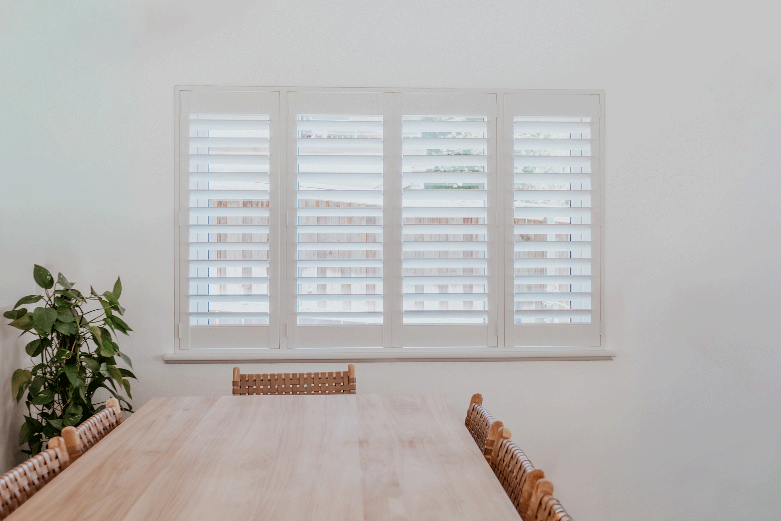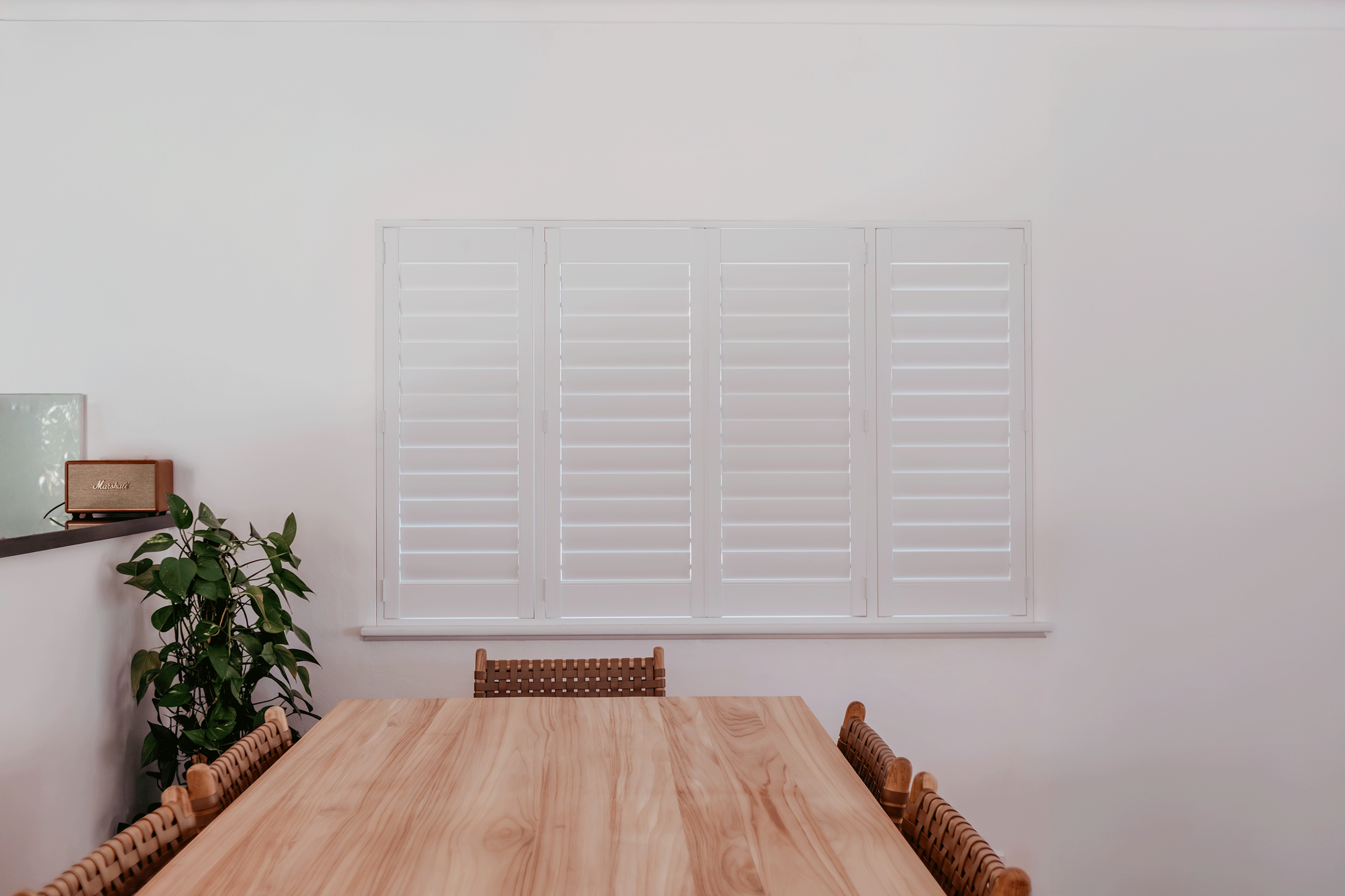 In the dining area, form meets fortitude. Belinda selected Luxaflex PolySatin Plantation Shutters for their timeless architectural presence and resilience.