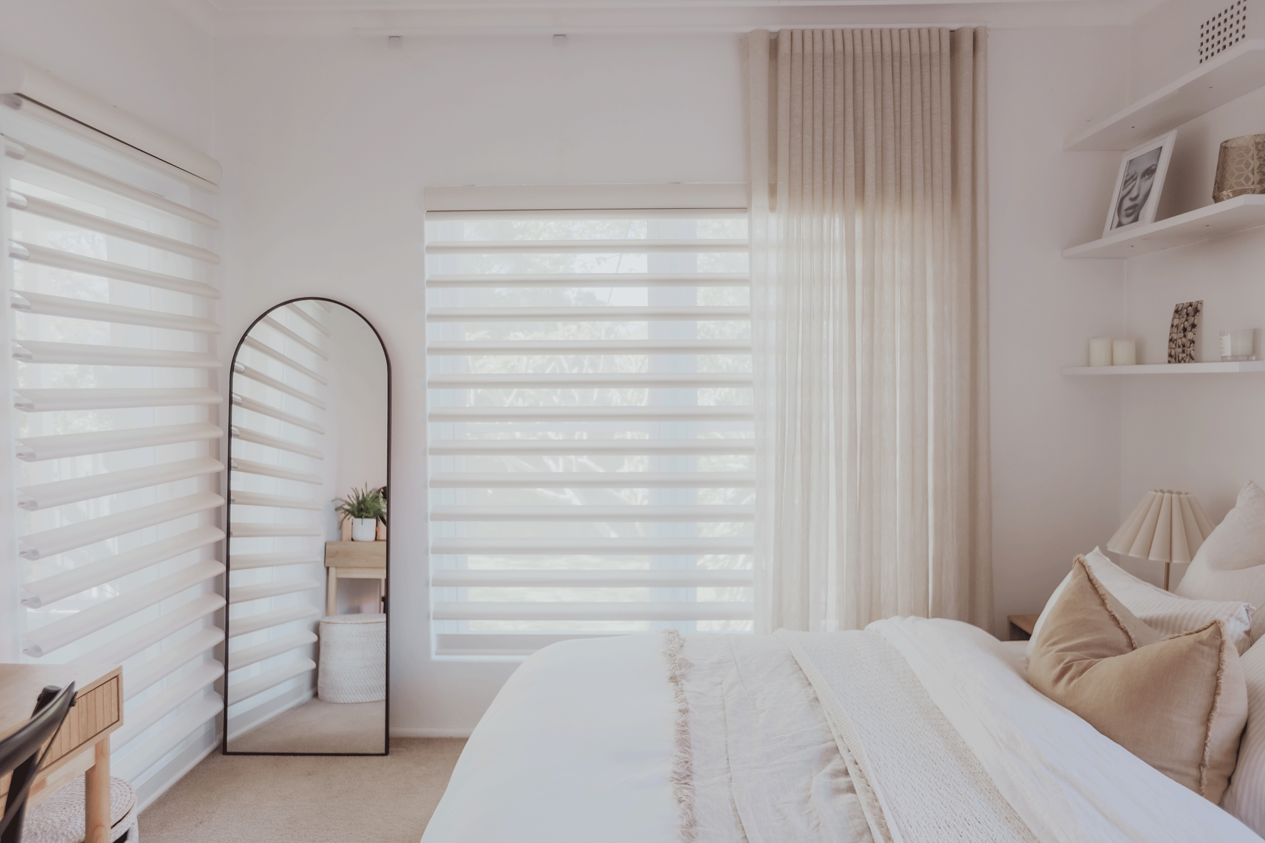 In the master suite, comfort is paramount. Belinda opted for Duette Shades in a DuoLite configuration, combining a blockout fabric for complete darkness with a sheer layer for daytime softness.