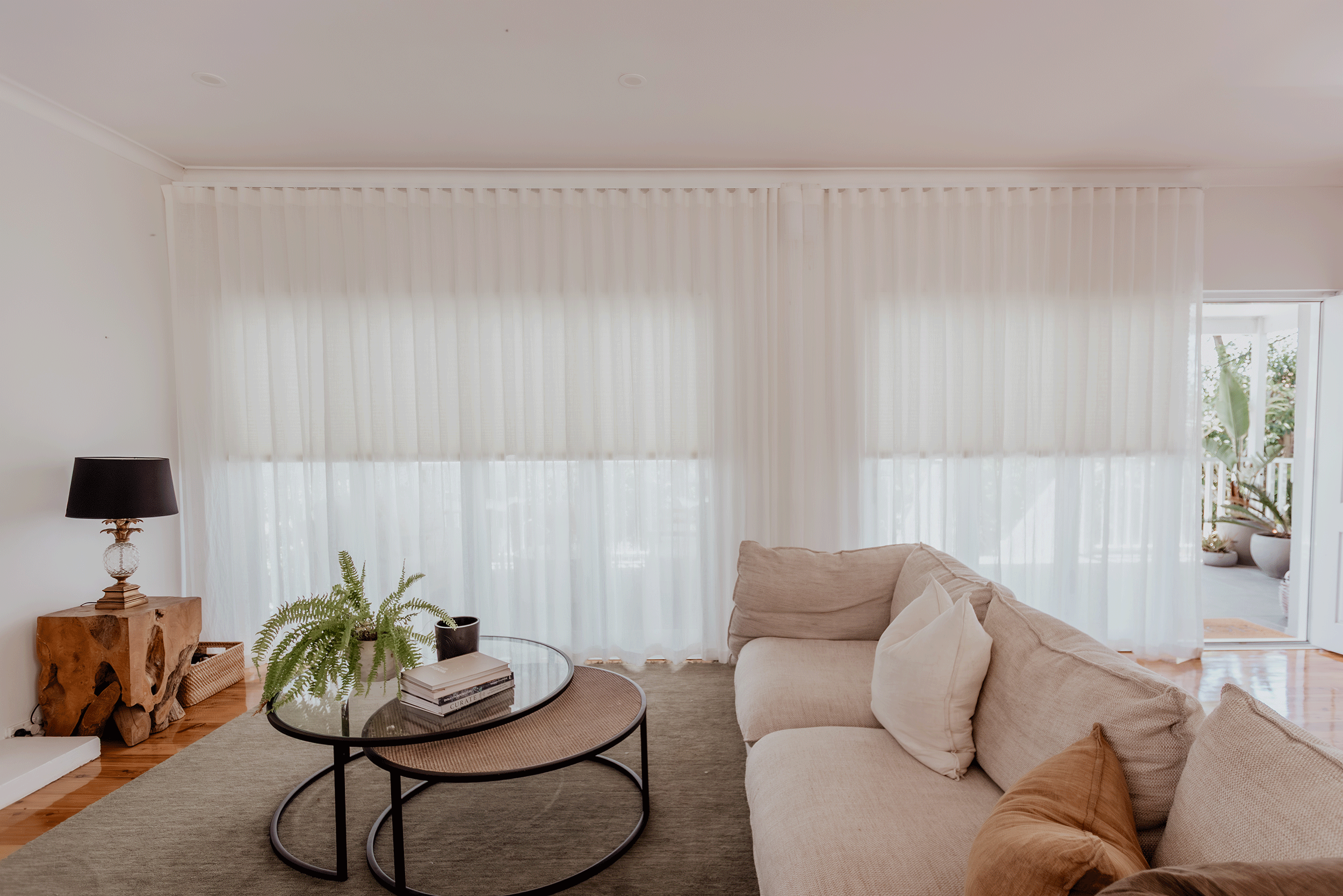 Now, full height Luxaflex linen curtains frame the space with understated drama. In 100 percent linen, they introduce softness and movement, gently diffusing the coastal light that pours in from the garden beyond.