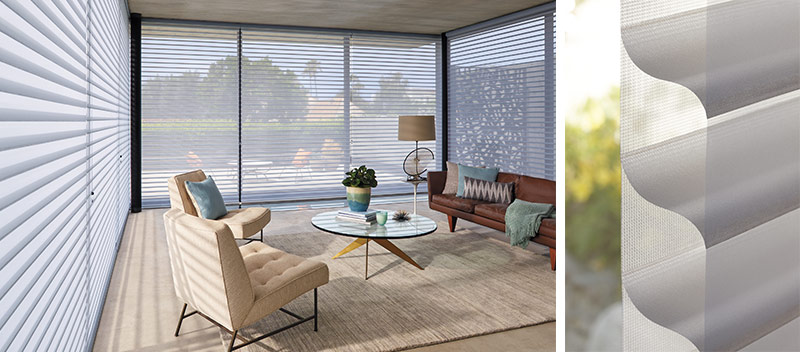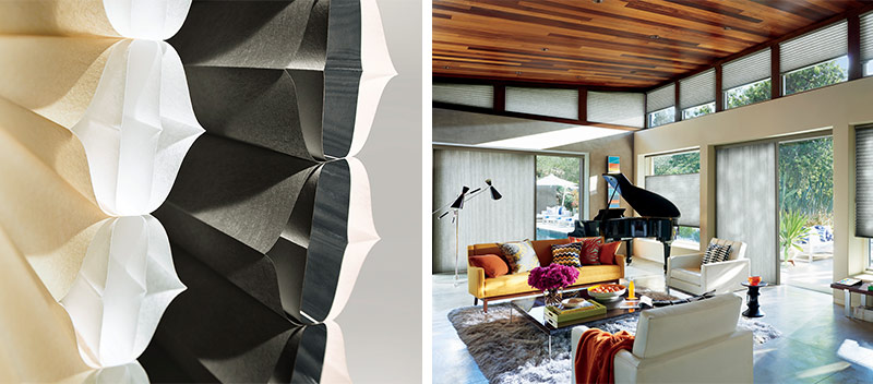 East and west facing rooms receive strong direct sunlight year-round. In summer, this intense heat can make these areas uncomfortably warm, especially if they include large expanses of glass. In these cases, insulating window coverings Luxaflex® Duette® Architella® Shades are designed to help regulate temperature by controlling heat transfer. The unique honeycomb-within-a-honeycomb structure of Duette® Shades traps air inside multiple layers, providing excellent insulation. This helps reduce heat gain in summer and heat loss in winter, keeping the room comfortable at any time of year.