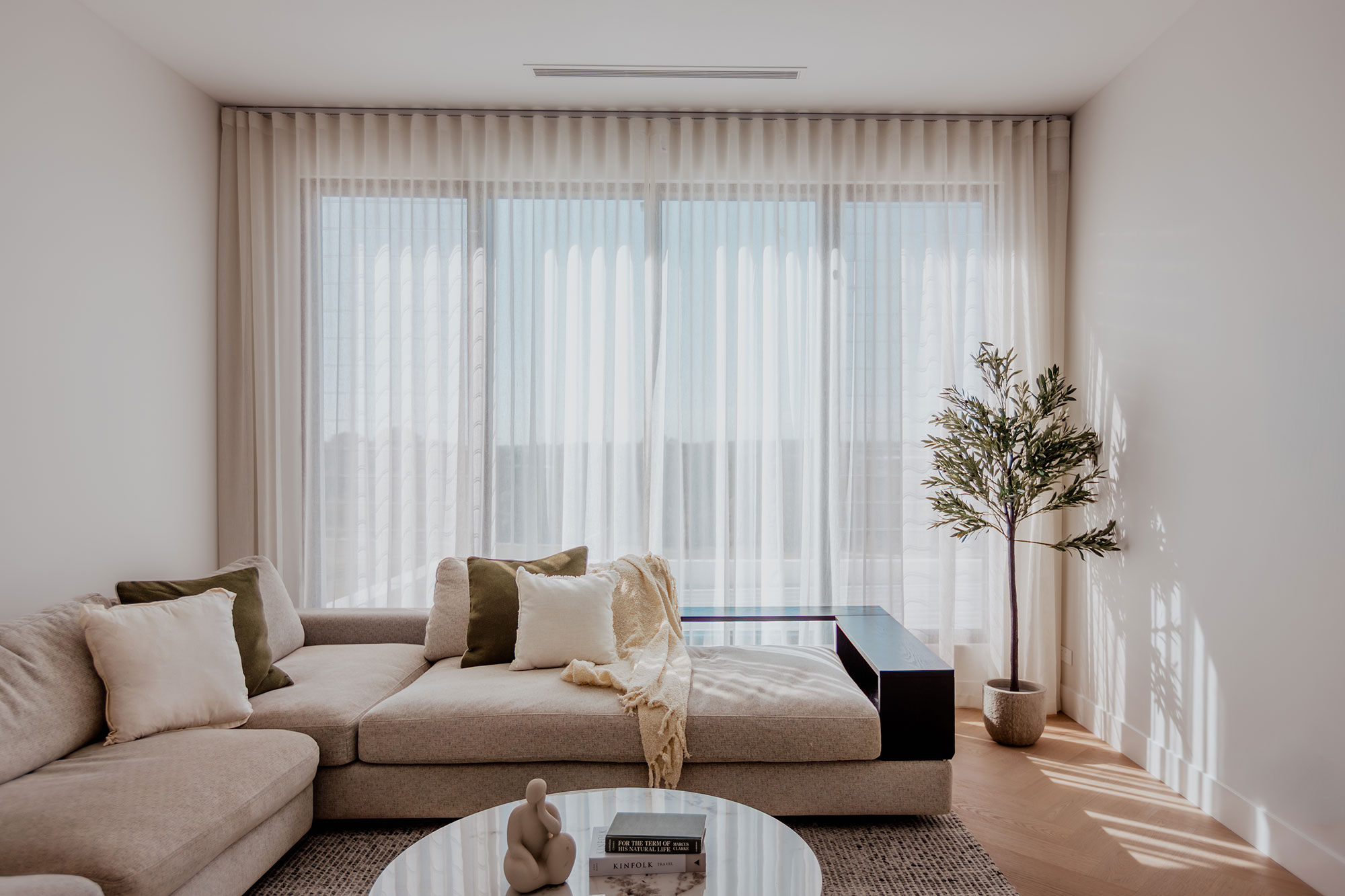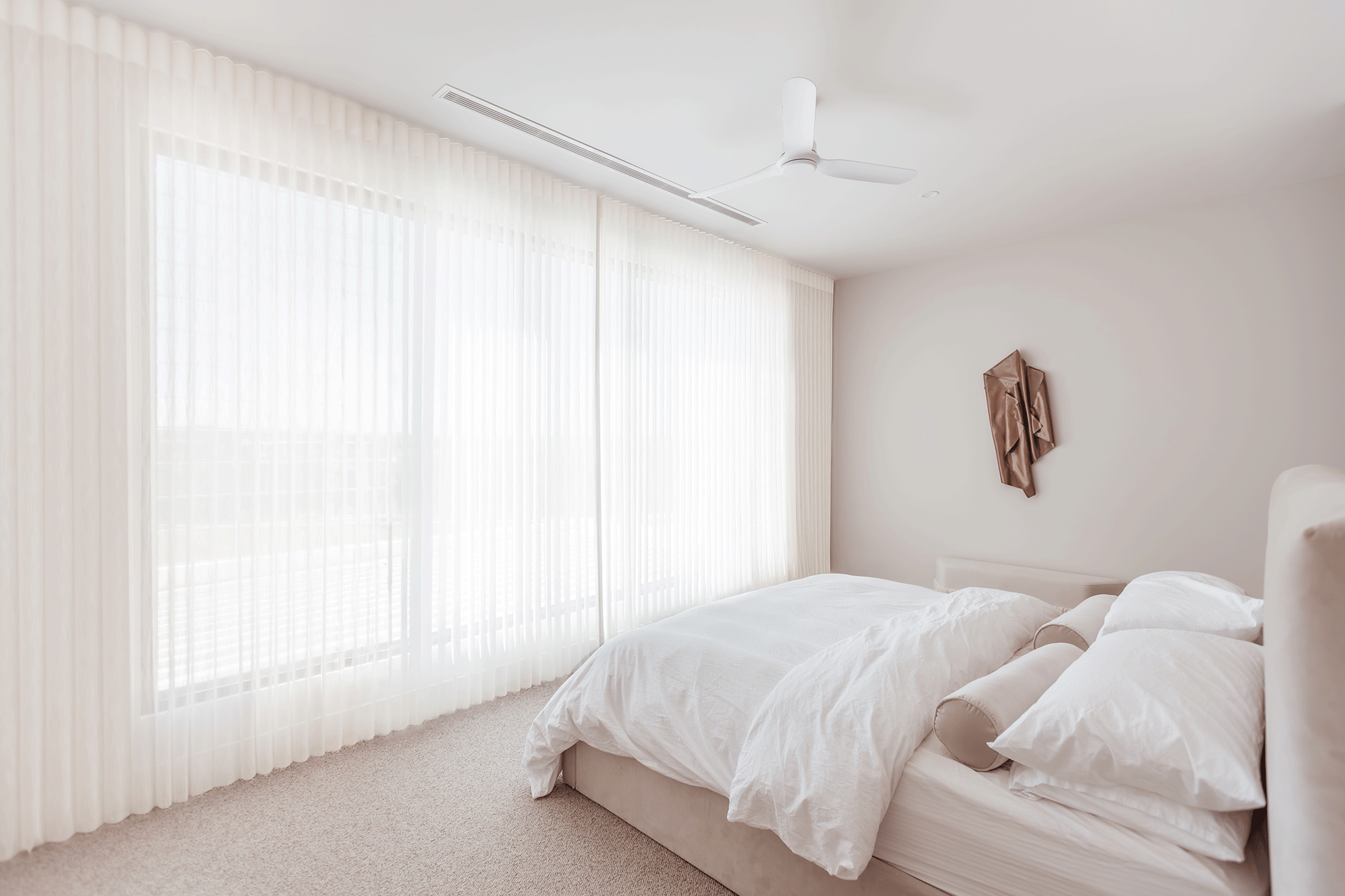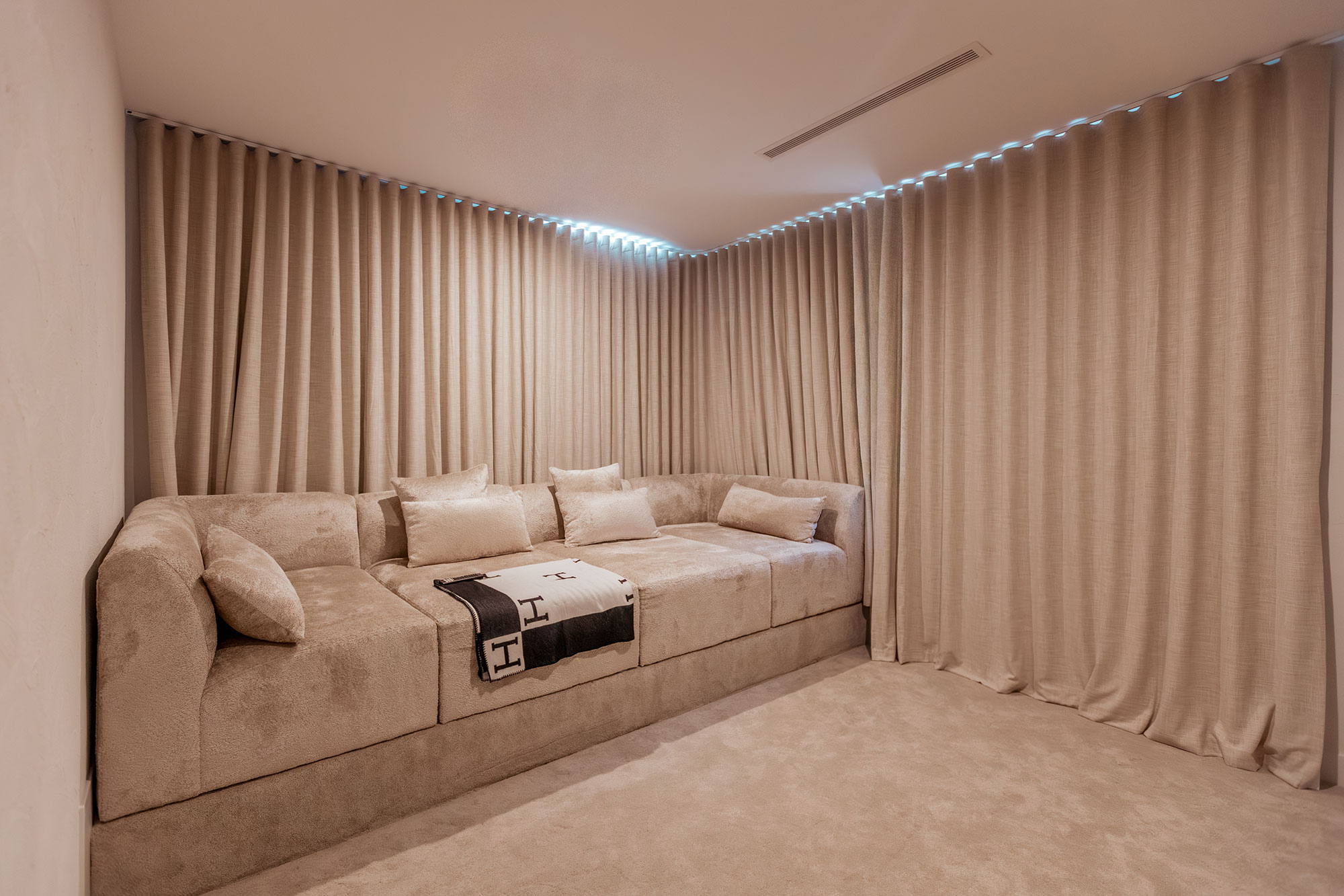 Their minimal projection ensures the space stays open and uncluttered, while the elegant drape enhances Veronica’s refined palette. The result is a serene retreat where softness and functionality work seamlessly together.