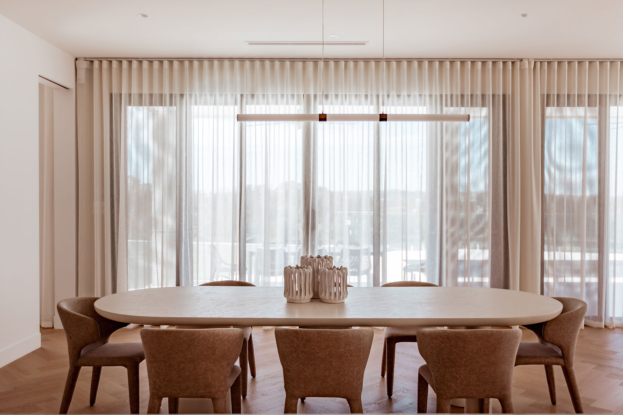 The living and dining areas are expansive, framed by wall-to-wall window doors that connect the family to the outdoors. To soften and unify the space, Veronica selected Luxaflex® Curtains in Lucent - Birch Bark.