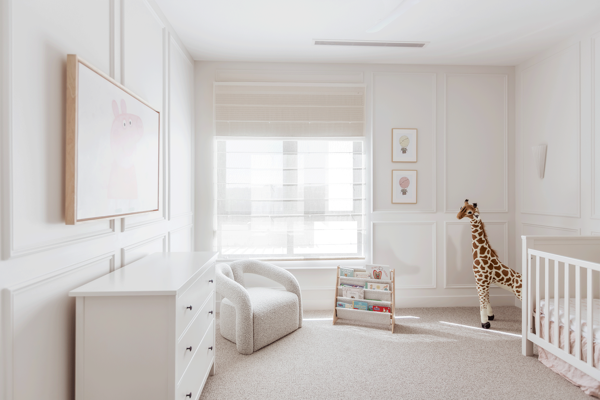 To introduce softness and a relaxed daytime atmosphere, she paired them with Luxaflex® Soft Roman Shades in Lucent- Sheer Linen. Together, they allow the rooms to shift effortlessly from quiet rest to softly lit, inviting spaces for play, reading or unwinding.