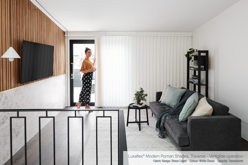 In the second living area on the first floor, we have big sliding doors that open onto the terrace. We selected Modern Roman Shades in ‘White Dawn’ with a Traverse operating method so the fabric vanes sit vertically and can be easily opened with the doors.