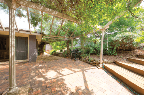 The backyard resembled more of a jungle with overgrown plants, an ugly leaky pergola, and a hidden pool. To open the space up and bring in more light, he got rid of the pergola and cut back the wisteria but left a section around the side.