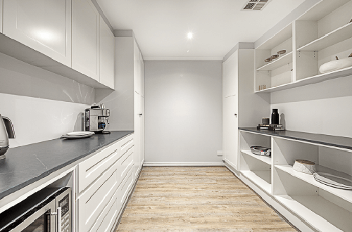 To fix the floor plan in the main living area – Shaynna put walls up and sectioned off the redundant formal dining. This then created a much more intimate lounge room, and a giant butler’s pantry for the kitchen, adding much needed storage.