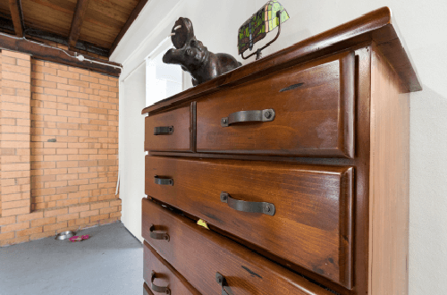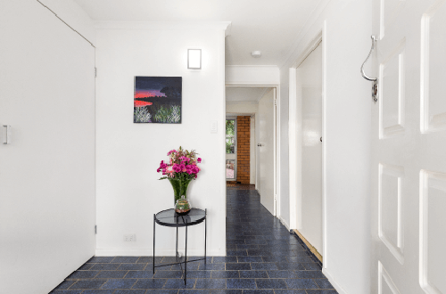 Charlie had some work to do to improve the street appeal. He clad the brickwork on the front façade, painted the garage doors, weatherboard, posts and window trims. He put in a raised planter box mass planted with succulents and clad the letter box to match. The upstairs front balcony was dressed and styled with lots of lush pot plants and hanging baskets, along with casual chairs. The existing concrete was tiled over and the existing paving was replace with stone paver stepping stones in the lawn.