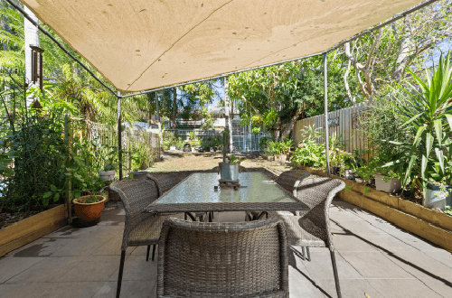 The shade sail in the existing paved outdoor dining area was stained and unsightly as was the paving itself. Charlie removed this sail and decided to clean the paving and install a new outdoor dining setting and cantilever market umbrella. He also dressed the area with large pot plants in the corner and small pot plants on the table.