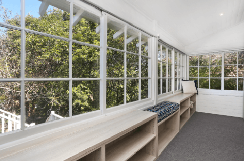 Clean and sleek Luxaflex® Roller Blinds were installed at the back of the rumpus room, with a translucent fabric selected to help cut the strong glare from the backyard and balcony.