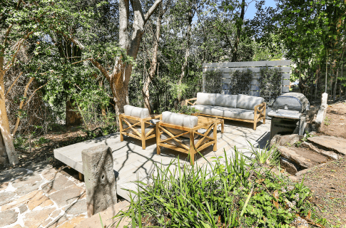 Another genius stroke was giving new life to the old dilapidated BBQ area, by putting in a new deck and plant screen for privacy. He also reused some of the old flagging to create another play space next to it. An old deck off the kitchen and living room was falling apart and looked old. So Charlie brought it back to life, re-staining, repainting and repairing it.
