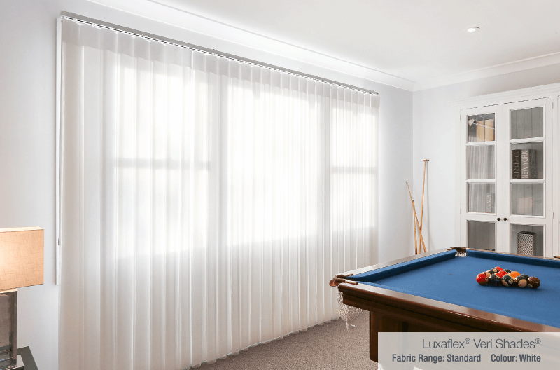 Veri Shades were also chosen for the large bank of windows in the rumpus room, for their highly versatile light control properties. The individually curved fabric vanes feature an alternating light filtering and room darkening fabric panel, which offer a diffused view-through when open, softer filtered light when tilted, and full room darkening (with the dark toned fabric options) and privacy when closed.