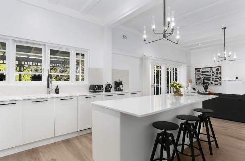 Another pokey area was the kitchen which was also very dated. Shaynna got the okay from our engineer to knock down yet another wall adjoining the large living area and turned that into a modern open plan space.