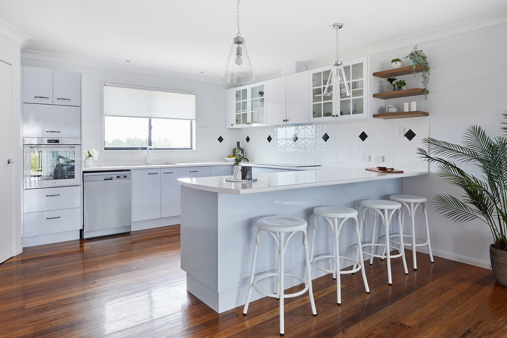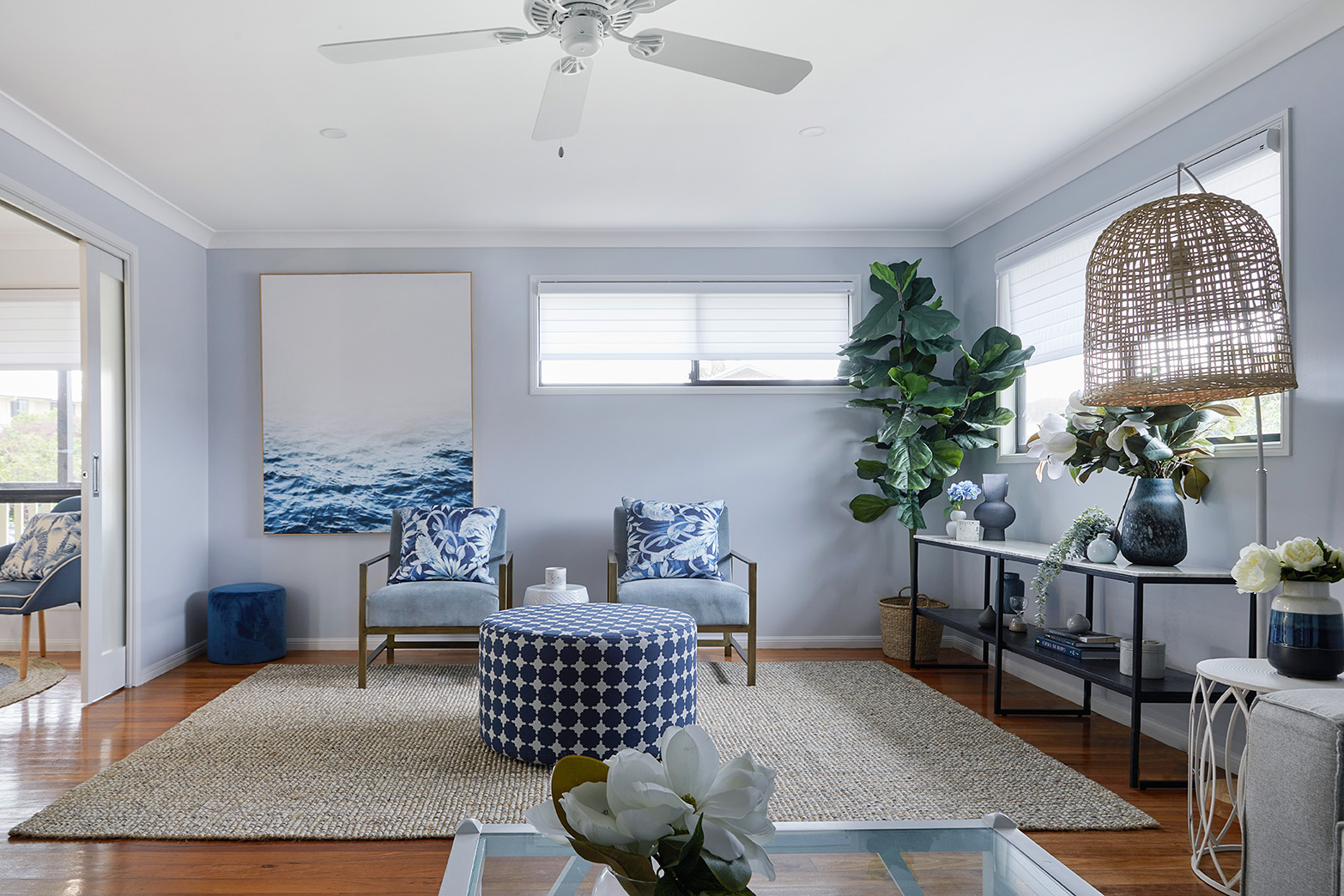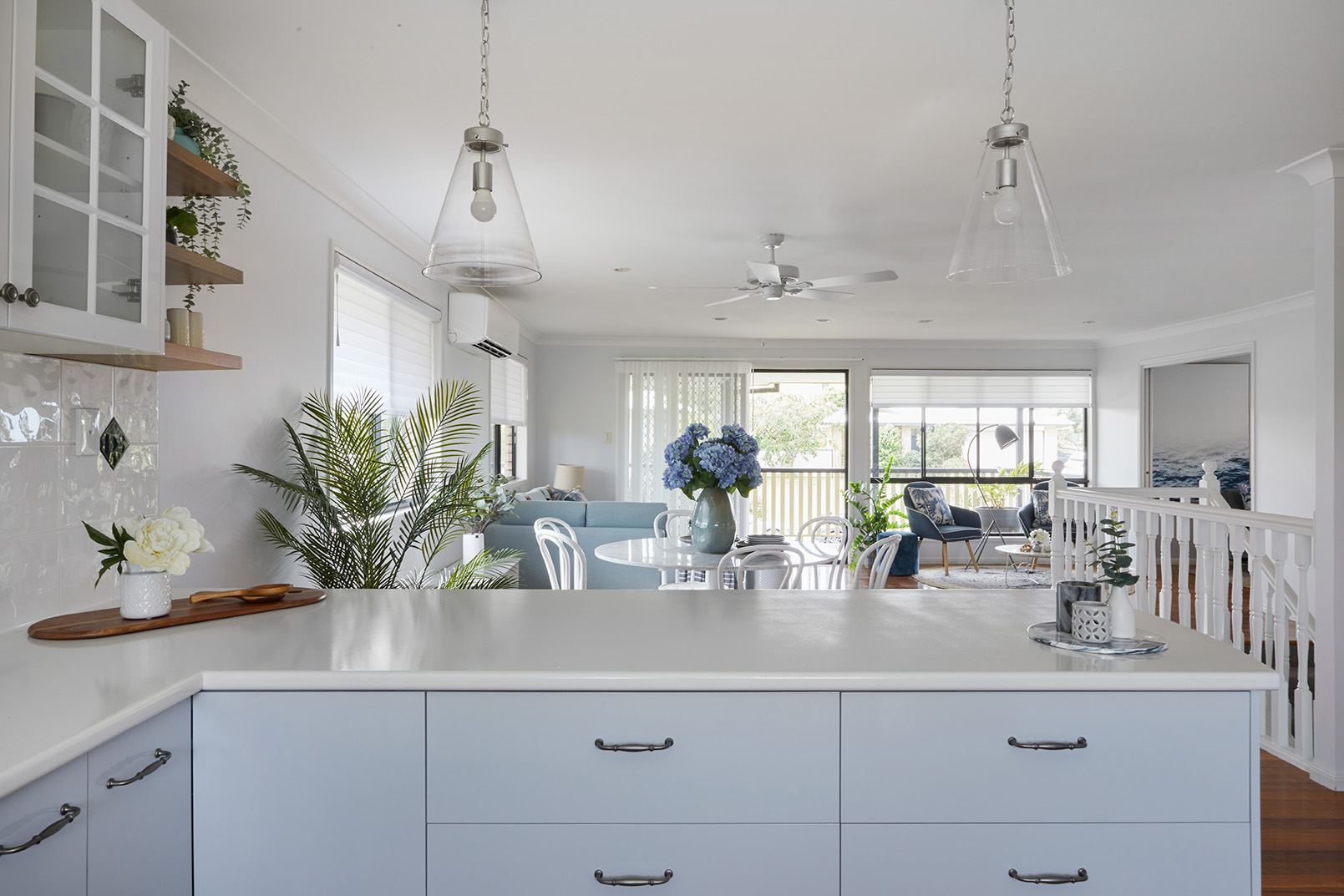 It’s true that kitchens sell homes. And while this home had a very functional and relatively new kitchen, it was calling out for a style update. Rather than replacing the cabinetry or benches, Wendy used a resurfacing approach—spraying the existing fittings with a pale blue colour and installing new handles and appliances. The team also replaced the existing shelving with overhead cabinets, which increased the amount of storage space in the kitchen for a small cost.