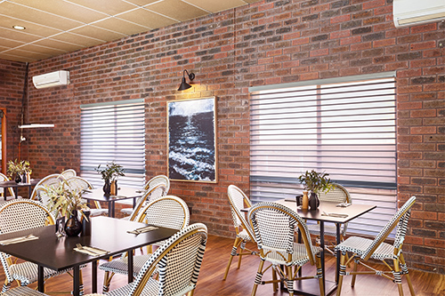 The carpet in the restaurant area had certainly seen better days, so Shaynna had it replaced with something more durable and easy to maintain. Commercial grade vinyl with an acoustic backing was used all throughout the bistro as it was family friendly and ideal for such a large high traffic area. Shaynna was mindful that the bistro was really the workhorse for the business and so all of the modifications made in the space needed to appeal to travellers, as well as the locals and their families. The new French- inspired chairs and tables added a modern touch to the restaurant, whilst the exposed brick tied in the traditional feel of the old pub. Luxaflex® Silhouette® Shadings were also used to dress the windows and brighten up the room.