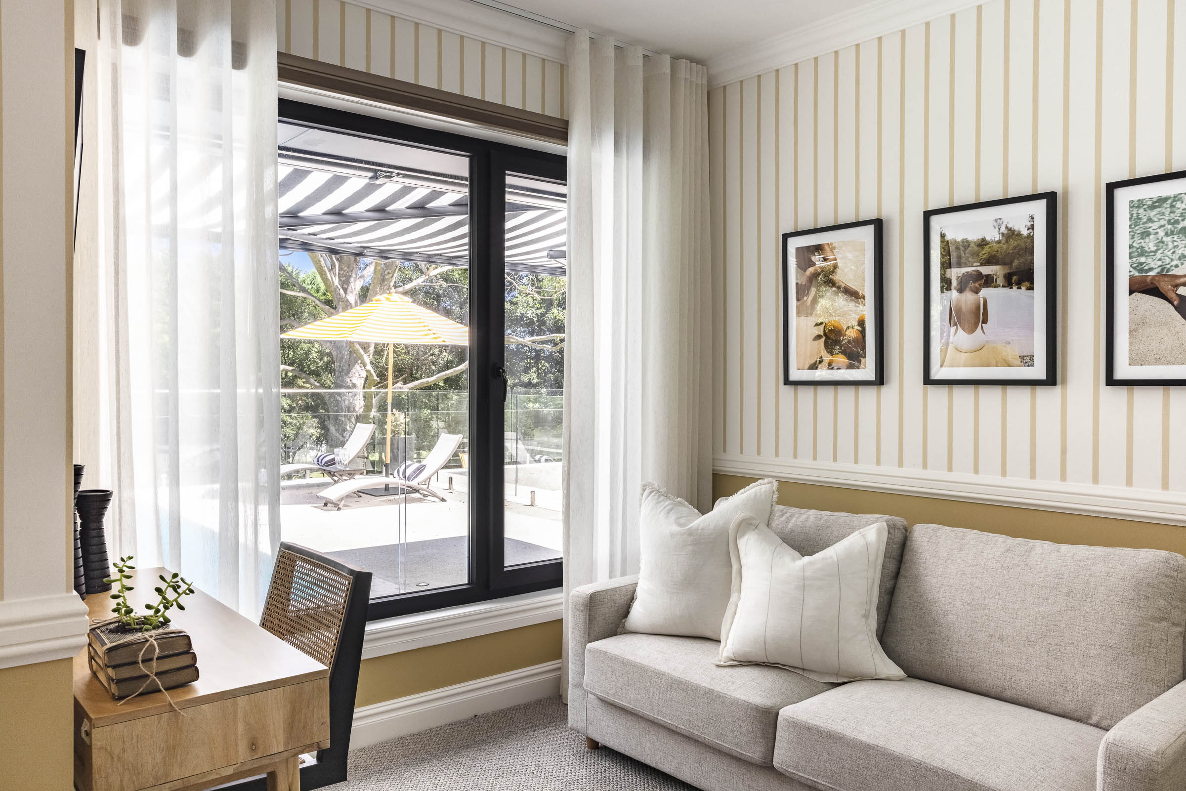 Their journey was captured as part of a special Holiday Home Makeover TV series on Channel 9—of which Luxaflex® is a proud sponsor. Throughout the home, the Carrs used a carefully curated mix of Luxaflex® curtains, sheers, blinds and awnings—each selected to enhance the look and functionality of the space. Here’s how.