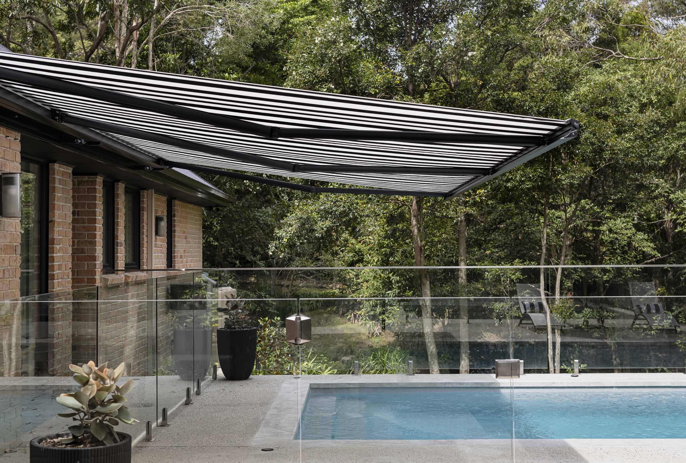 In the pool area, they chose the Luxaflex® Nordic Arafura Awning in black and white colours, a striking and functional solution that offers all-important sun protection without disrupting the aesthetic.
