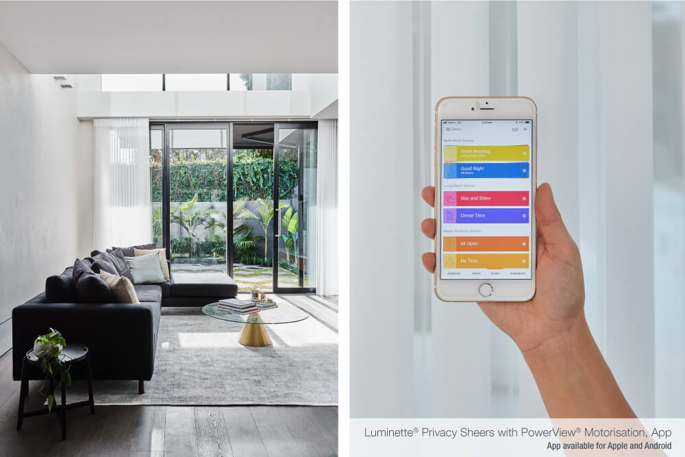 Luminette® Privacy Sheers with PowerView® Motorisation, were used to dress the large glass sliding doors in the living room. The addition of these elegant Softshades in the colour ‘China White’ help to soften the space and provide a sense of luxury, and are what Alisa and Lysandra consider ‘the icing on the cake’.