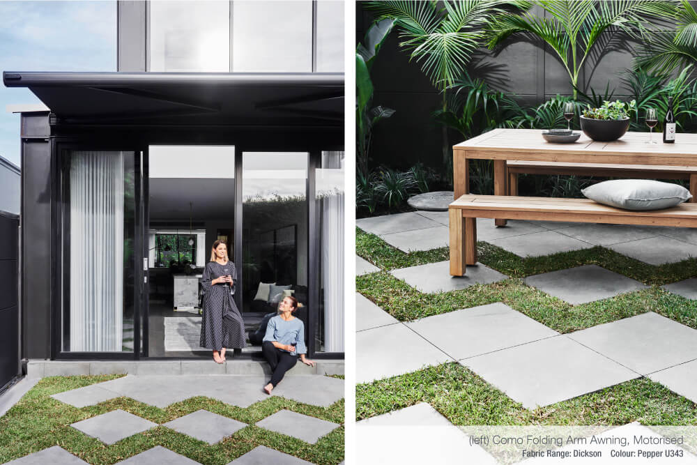 Alisa and Lysandra featured a Luxaflex® Como Awning on the terrace exterior. When opened out to its full projection, this folding arm awning acts as an extension of the living room, creating a seamless flow through from the indoors to the outside. Motorised operation was selected for added convenience and control. With a touch of a button the awning opens out to provide shade from the summer sun, creating a comfortable environment to relax or entertain under.