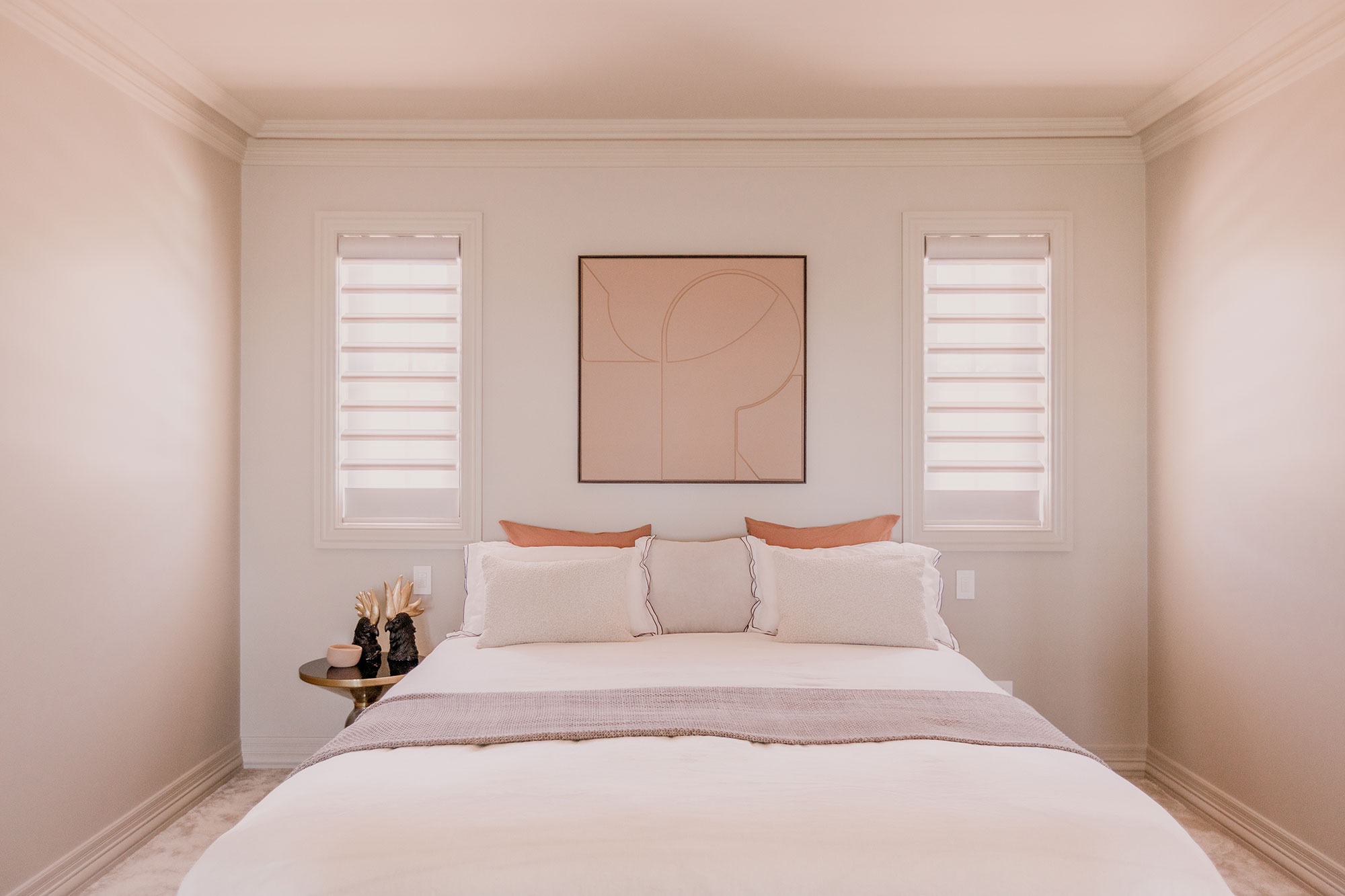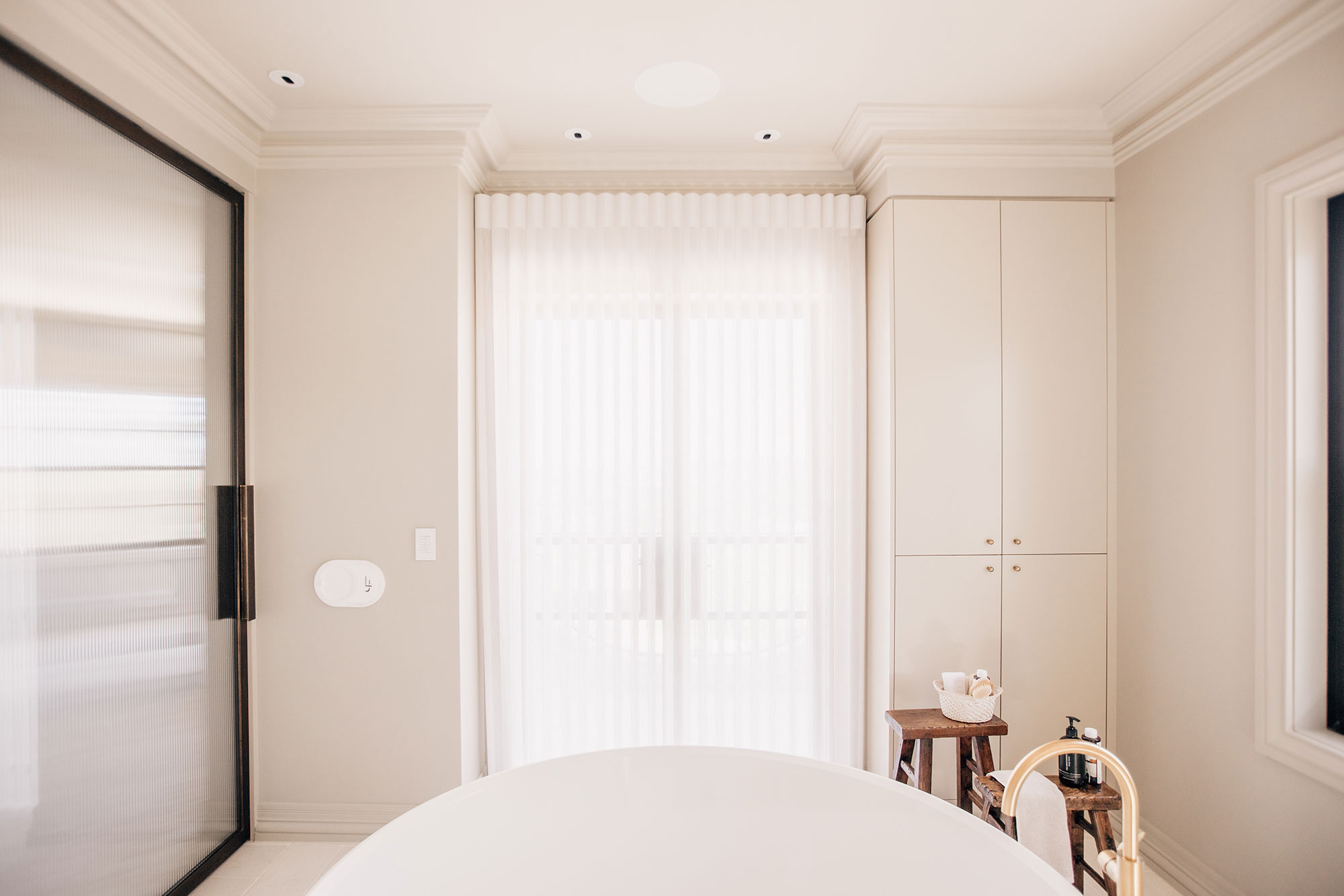 In the ensuite, Luminette® Shadings dress custom French doors, allowing light to filter through while preserving privacy.