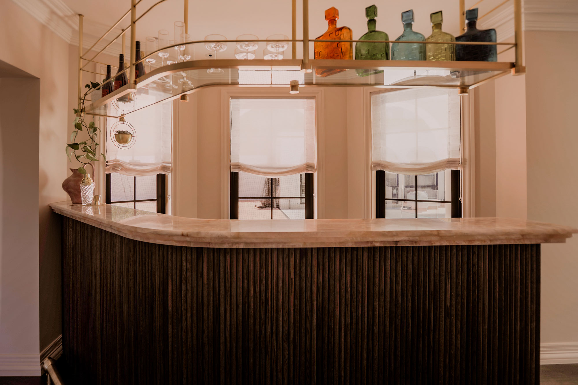 Transitional spaces have been given the same level of consideration. The bar, hallway and bathroom are softened with relaxed Roman blinds in sheer fabrics, adding cohesion and warmth while maintaining privacy where required. The distinctive pink bar becomes a true feature, elevated by the softness and texture of the relaxed Roman blind.