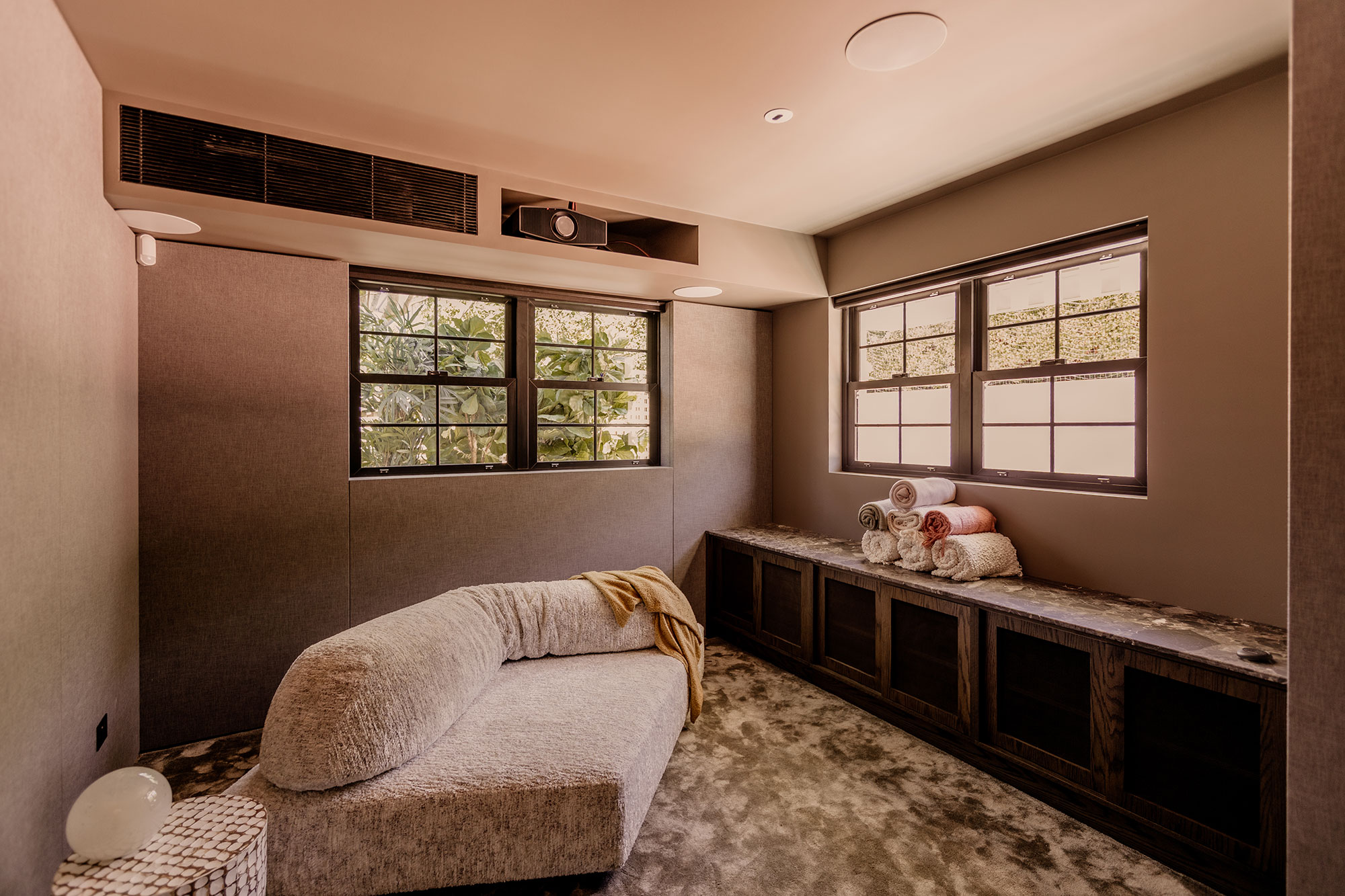 Designed for complete immersion, the cinema room offers a striking contrast to the lighter spaces of the home. Automated Duette® Shades in a blockout fabric deliver true darkness and acoustic comfort, transforming the room into a space designed for retreat.