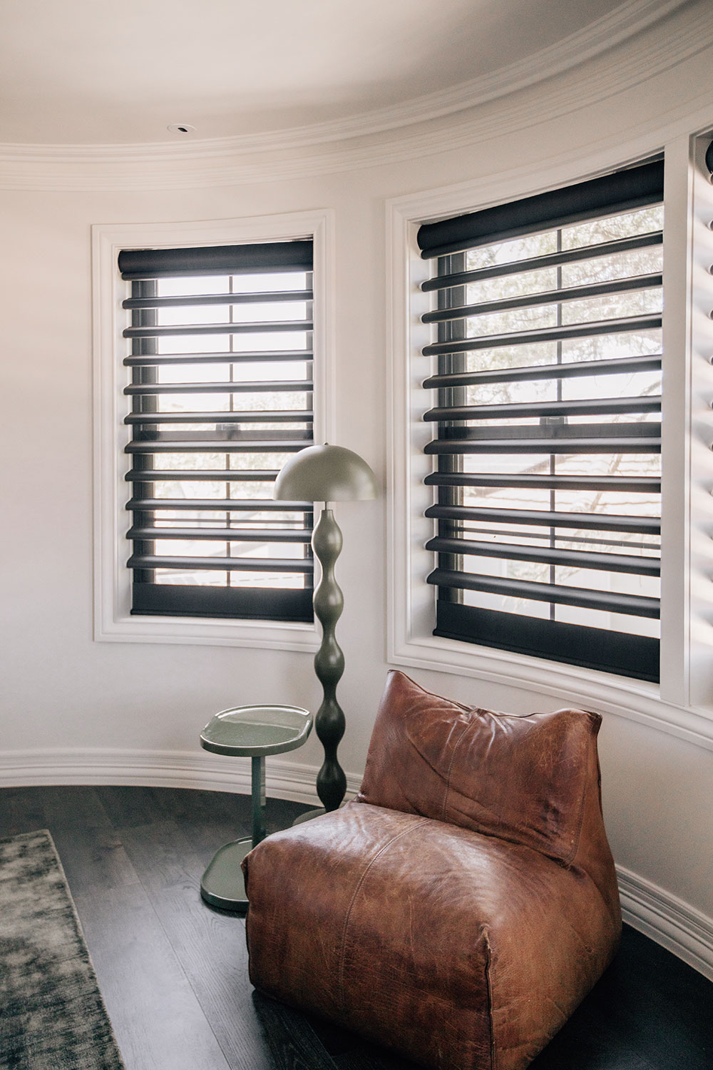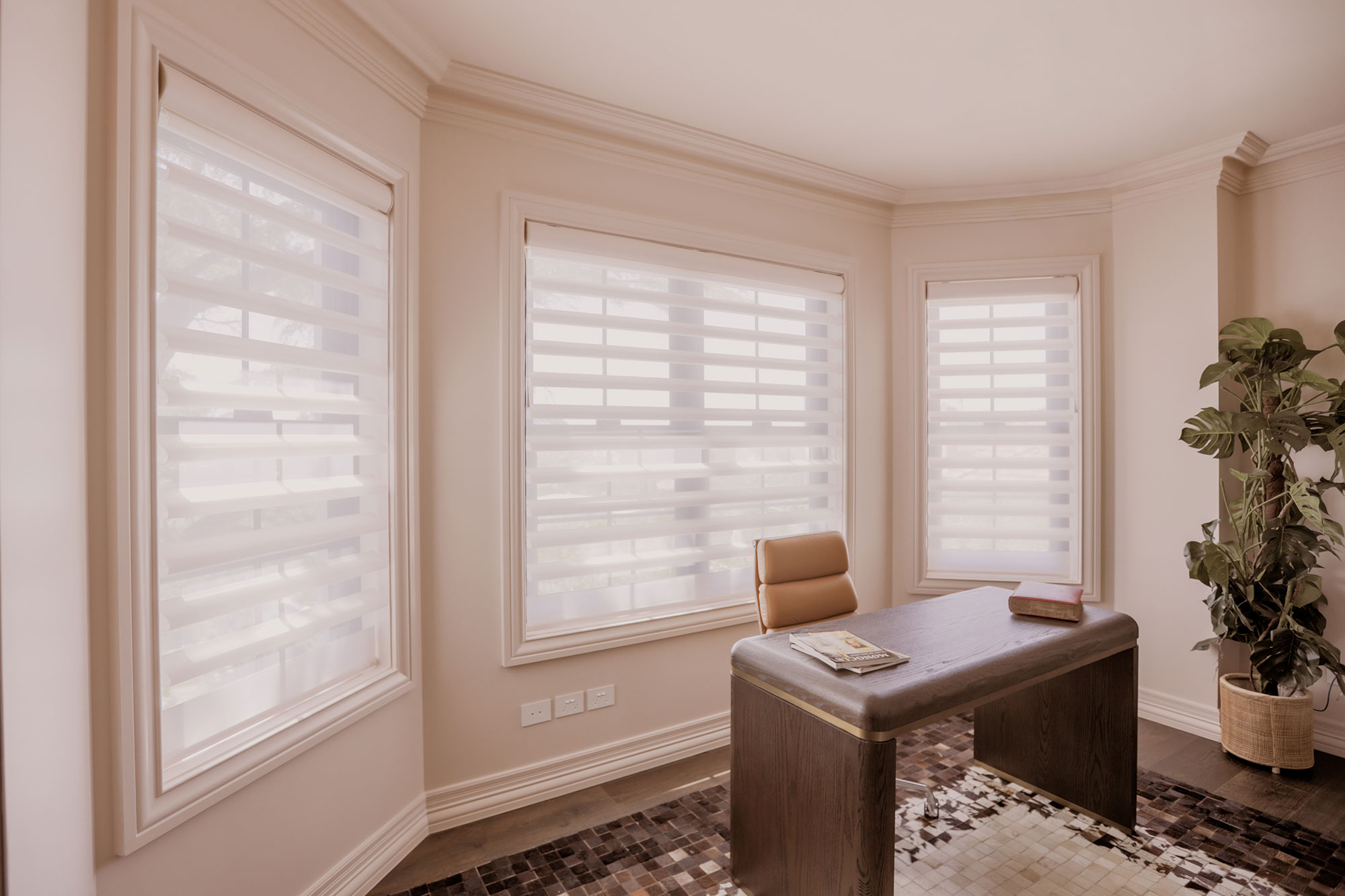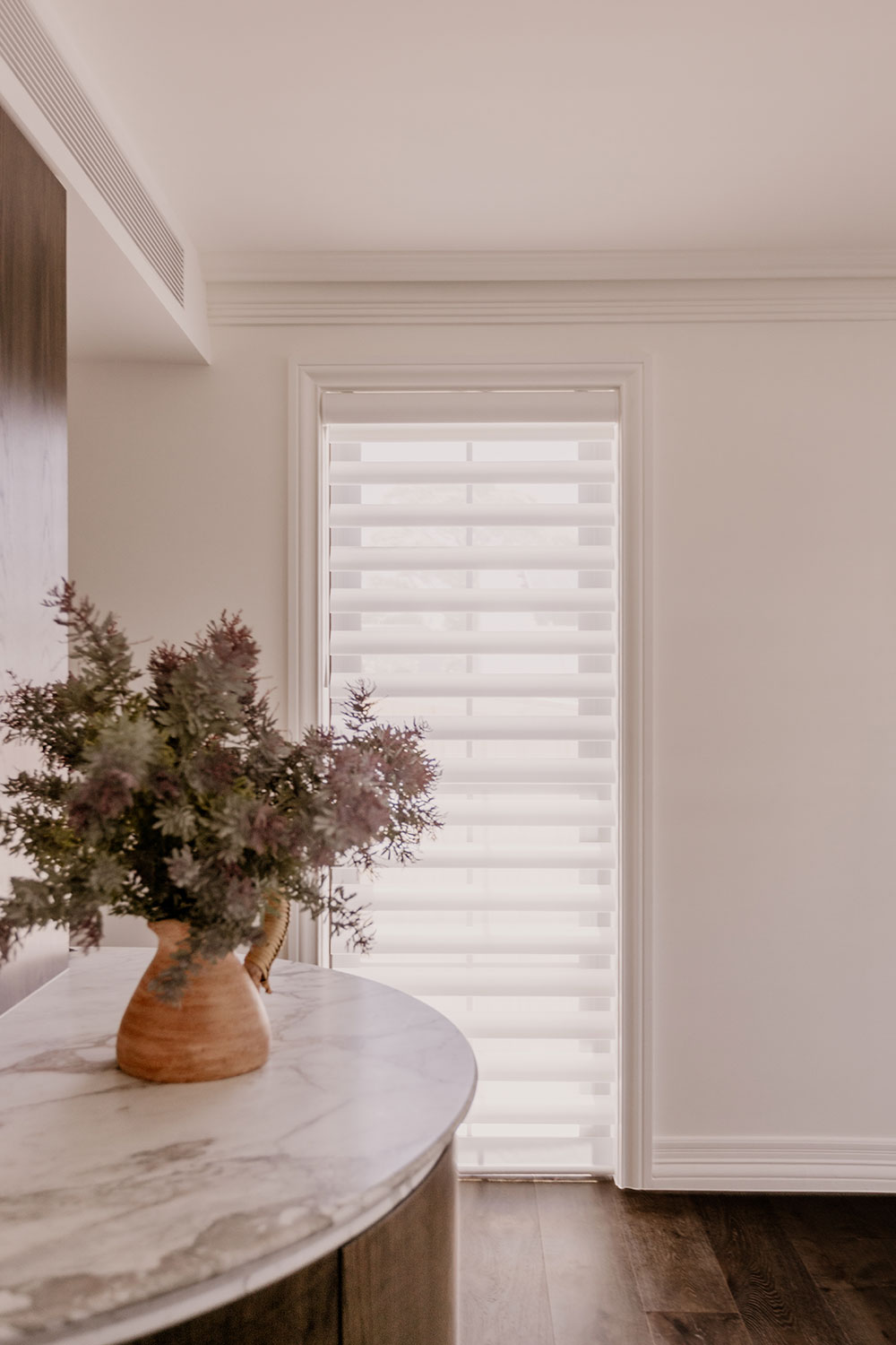 Upstairs, the master suite is intentionally serene. Automated Pirouette Shadings with room-darkening fabrics are used throughout the bedroom, living area and walk-in robe, creating a seamless and calming environment.