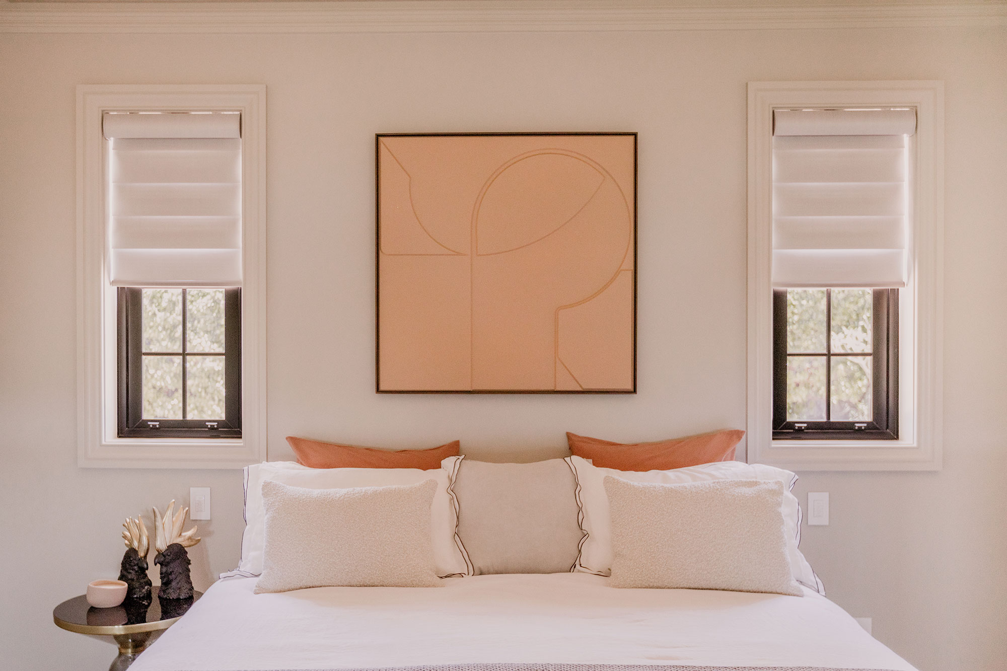 Bedrooms across the upper level are tailored to their outlook and orientation. On one side of the corridor, Duette Shades are paired with sheer curtains, combining the functionality of blockout shading with a soft, layered finish.