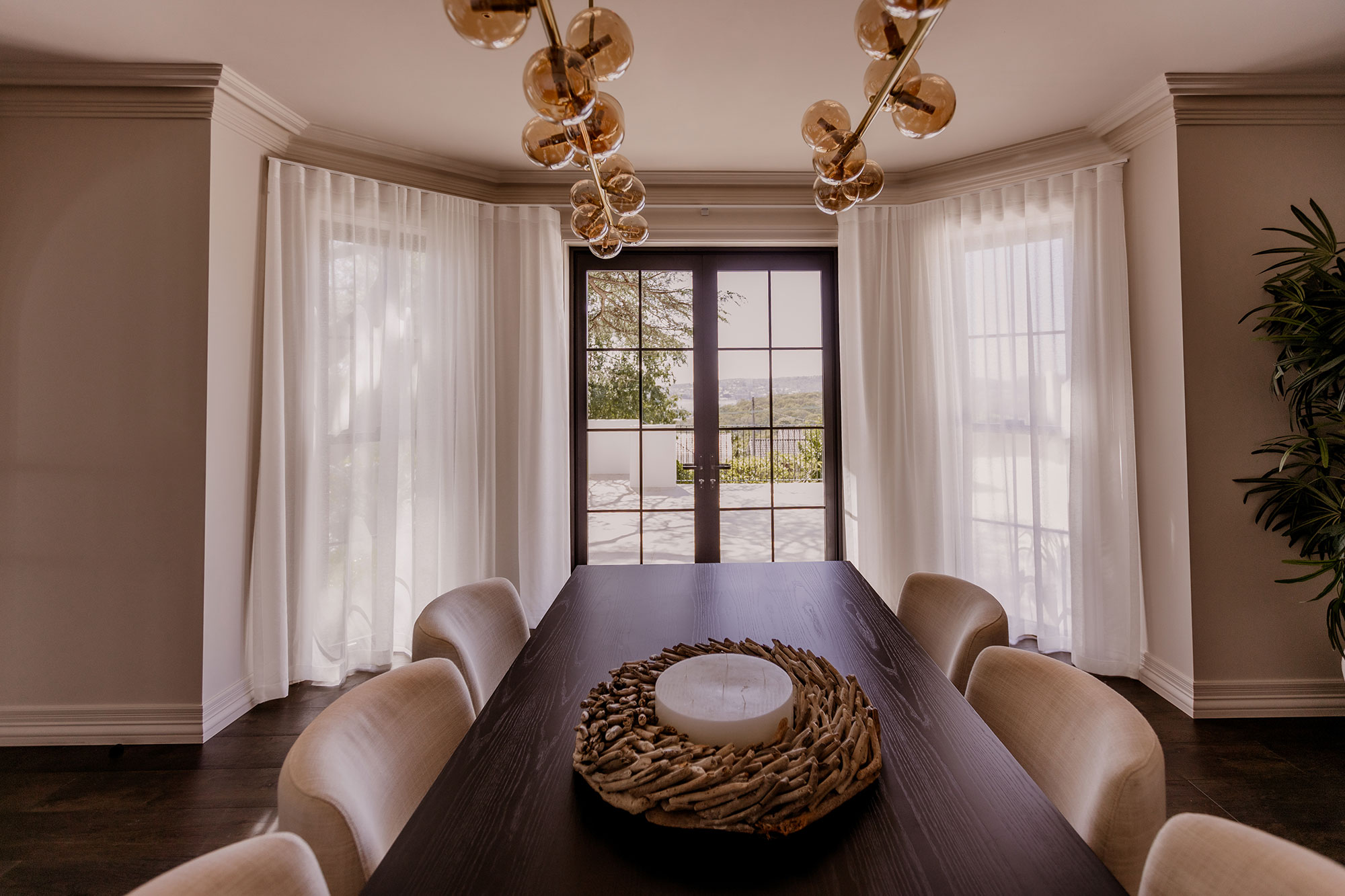 The formal dining room introduces the palette of the home. Sheer curtains on champagne tracks frame both French doors and windows, creating an elegant backdrop that enhances the sense of occasion without blocking natural light.
