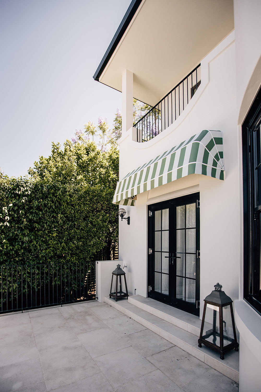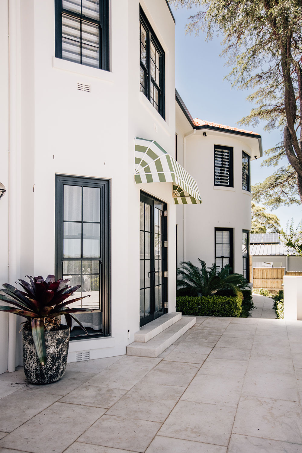 At the entrance, green and white striped canopy awnings set a quietly confident tone. Framing the front façade, they introduce colour and rhythm while offering practical shade to the doors beyond.