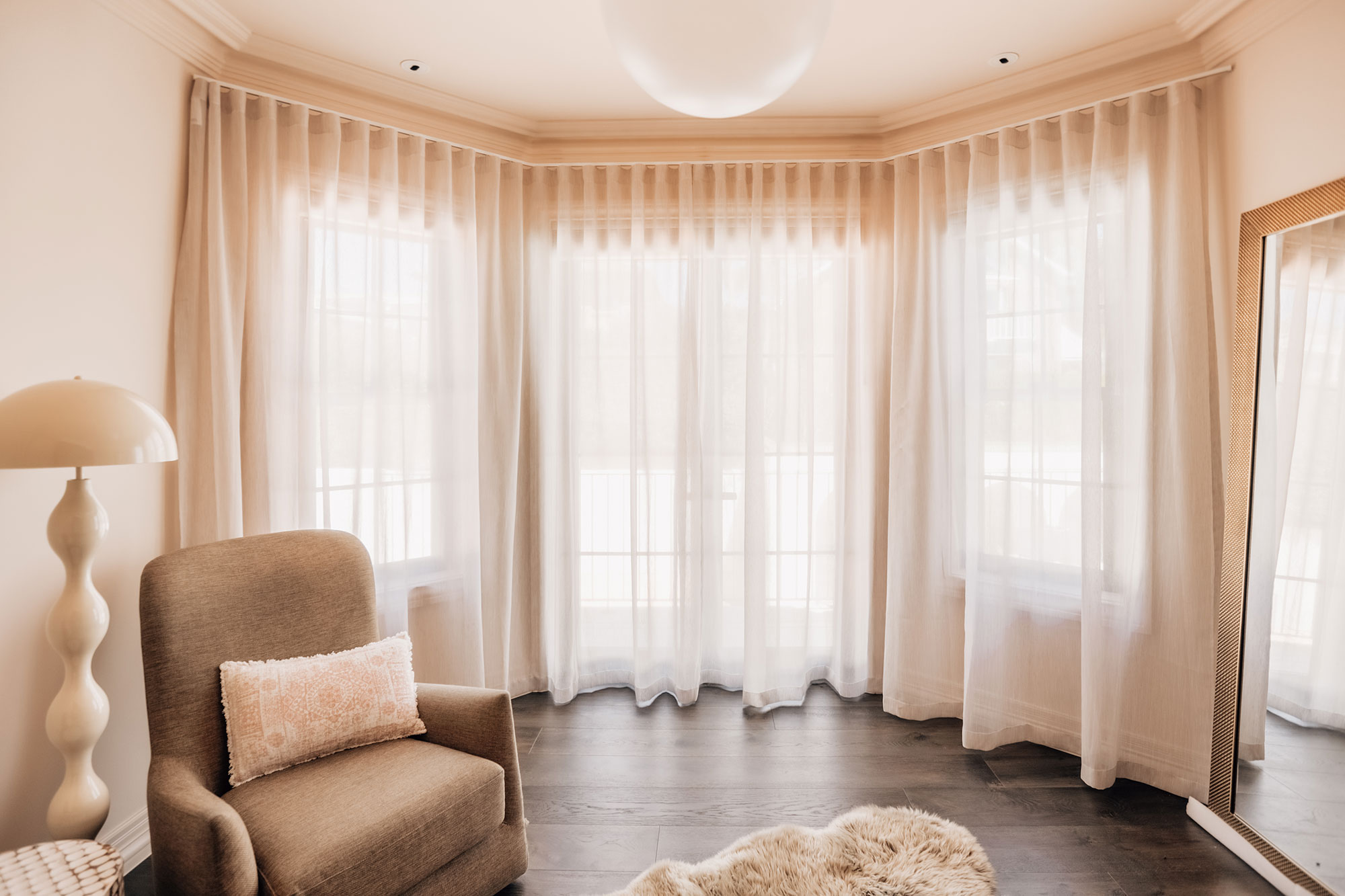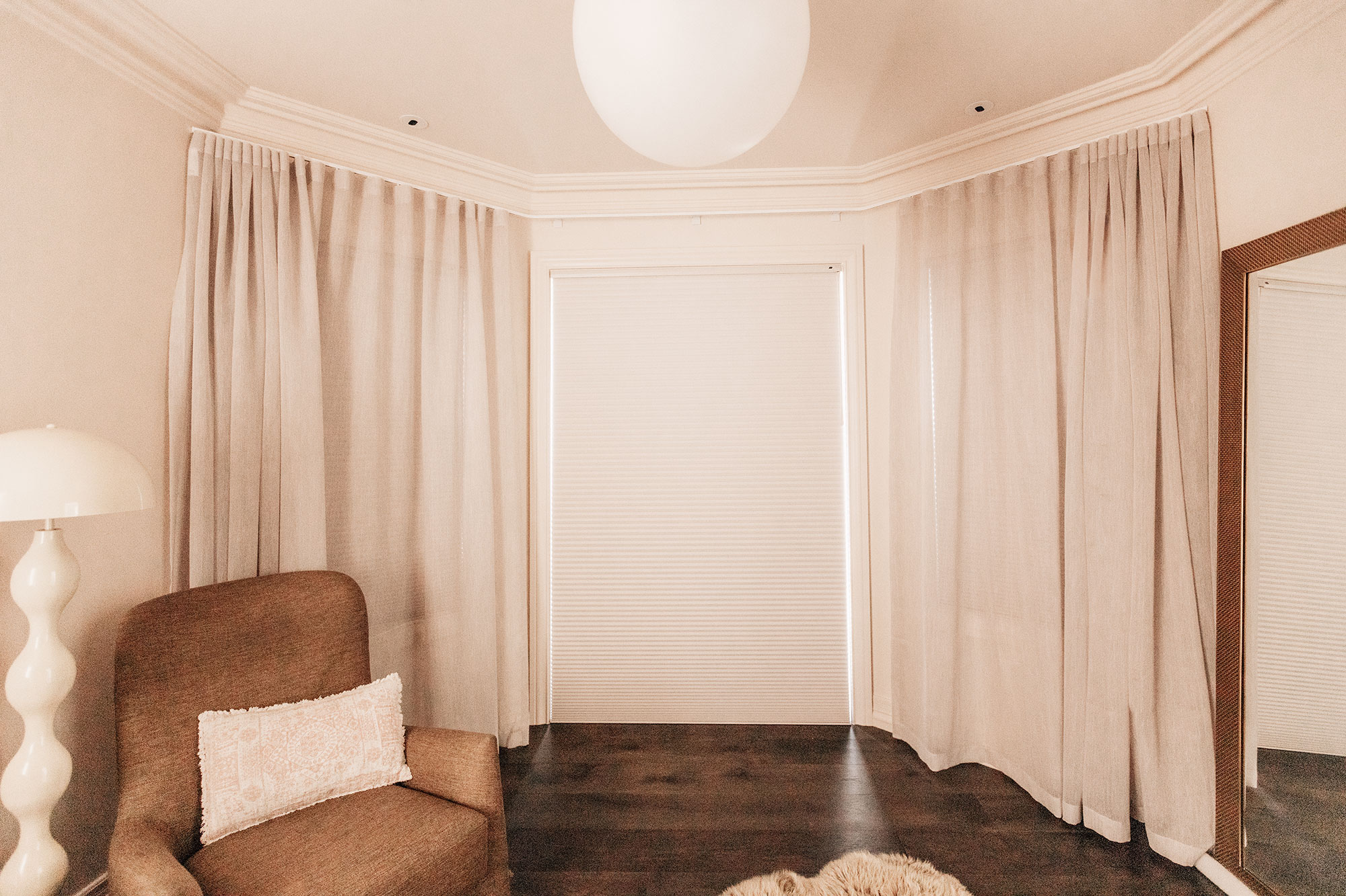 Fabric details: Duette Shades in Reception Barely There Blockout. Sheer curtains in Vallarta Carrara.