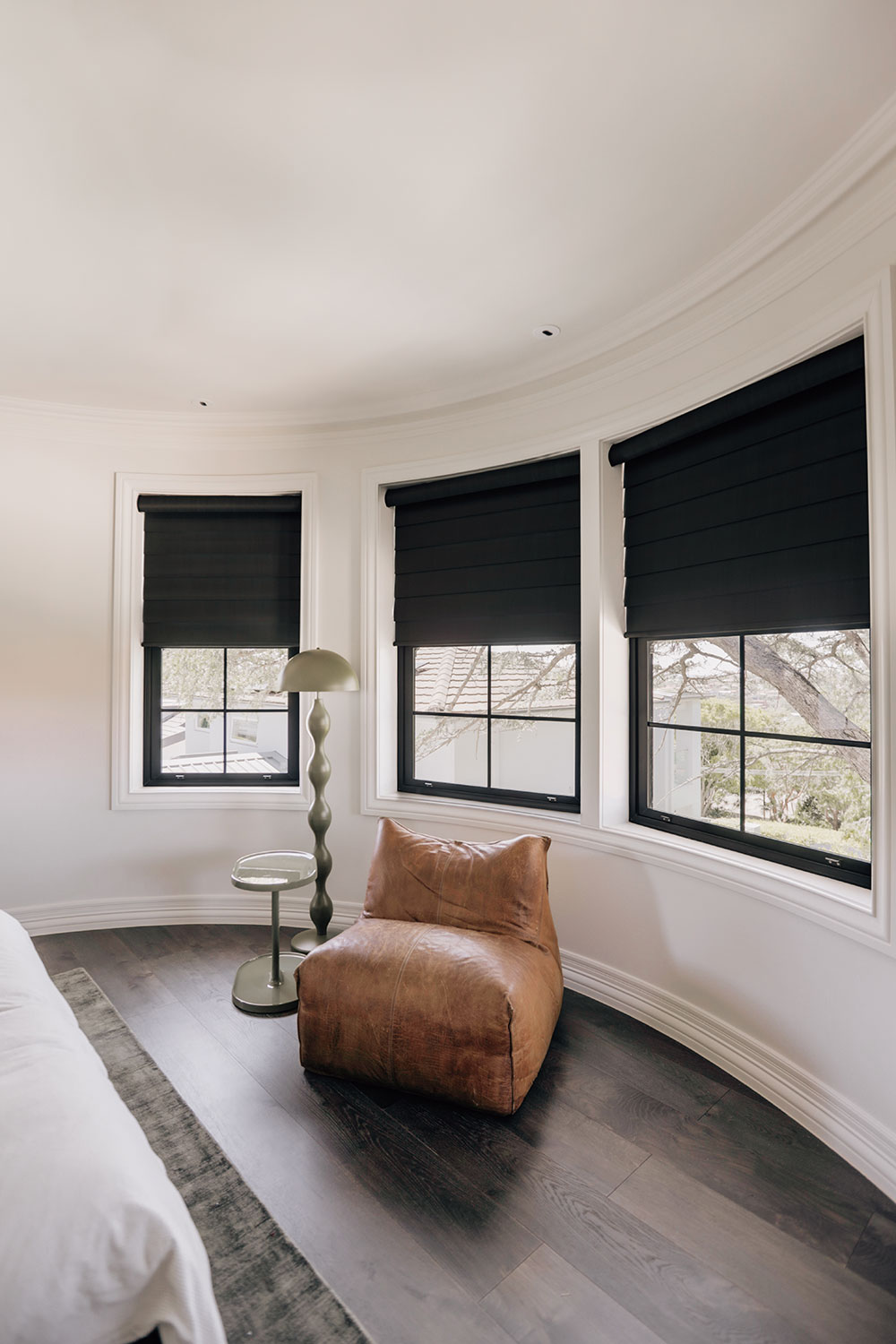 Relaxed Roman blinds and sheer curtains introduce texture and warmth throughout the living zones. A picture window becomes a quiet focal point, left intentionally untouched to preserve uninterrupted views of the established cedar tree beyond.