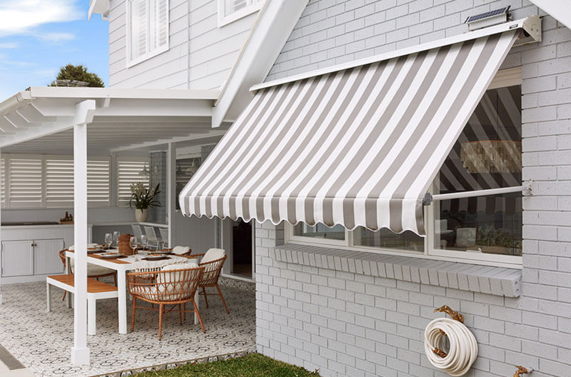 As the rear of the home is north facing, the team needed to find a way to shade the dining room which overlooks the pool. They chose a striped Luxaflex® System 2000 Awning to cover the dining room window – which can be fully extended for shade, or retracted when the family wants to let more light inside. This smart awning also has a solar-powered motor, meaning it can be automatically extended or retracted from inside the home – an ideal option if it starts to rain! The team chose Dickson fabric, the BS Grey 8907 colour, and an acrylic finish.