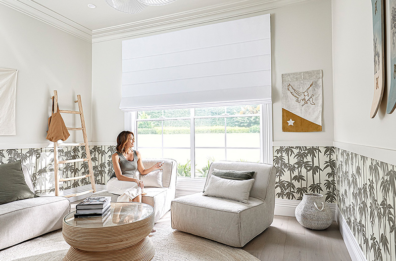 To ensure this space can support total rest and relaxation, the team chose Luxaflex® Roman Shades in the Beach Blinds variety, with blockout fabric. These smart blinds make it easy to quickly adjust the light flowing into the pool house, while fusing seamlessly with the stylish interiors. The team also chose the PowerView® Motorisation option for these blinds, which means they can be quickly opened, closed or adjusted with the touch of a button – ideal for long, lazy summer days.