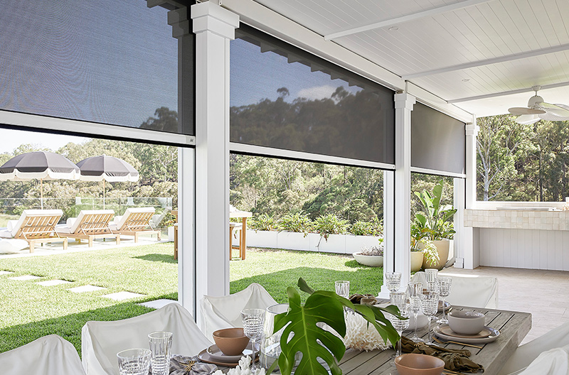 The outdoor terrace of the pool house, which features a large table and BBQ, can also be turned into an outdoor room with a spectacular Luxaflex® Evo MagnaTrack Awning. With official Australian Made qualifications, this is the most technology advanced straight-drop outdoor blind on the market. It provides floor to ceiling protection from the sun as well as insects. Making it the perfect awning for your outdoor entertaining areas.