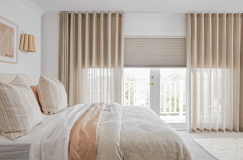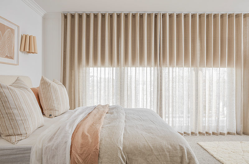 To complete the look of sophistication in this space, the Three Birds team also chose Luxaflex® Curtains in Zion fabric to sit over the Duette® Shades. They also used these same curtains as a cover for the decadent walk-in robe.