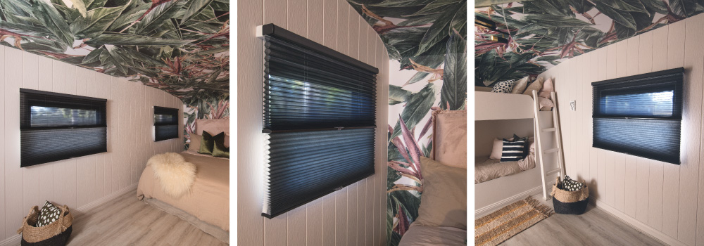 As mentioned in ‘10 ways to make a small bedroom feel bigger’ your window coverings should be kept simple by ditching billowing curtains which intrude on space and choosing slim-line blinds instead. The decision to dress the caravan windows with Luxaflex® Duette® Shades shows that the Three Birds Renovations team has done exactly that! These innovative SoftShades feature a sleek and innovative hardware design, which together with the pleated Architella fabric allows shades to tightly stack away into the headrail. The bold colour choice for these blinds also adds to the striking finish of the charming little caravan.