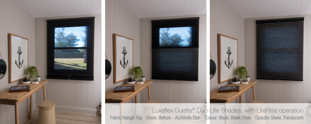 Luxaflex® Duette® Duo-Lite Shades with LiteRise operation were the window covering solution of choice for the living room and bedrooms in the River Shack. The innovative Duo-Lite design which teams two separate fabric panels (in either sheer, translucent or blockout fabric opacities) together to create one clever and seamless blind, fit the brief perfectly and this is why…