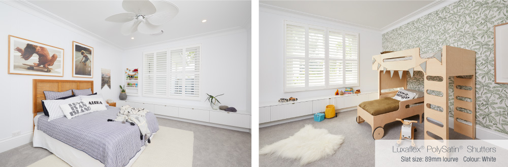 Luxaflex® PolySatin Shutters were the obvious choice for the window coverings in Bonnie’s kids bedrooms. Not only are they highly durable and backed with a 20 year warranty, they are easy to operate and above all completely cord free and child friendly. The simplistic nature of these Shutters also meant that they would maintain their stylish appeal for years to come!