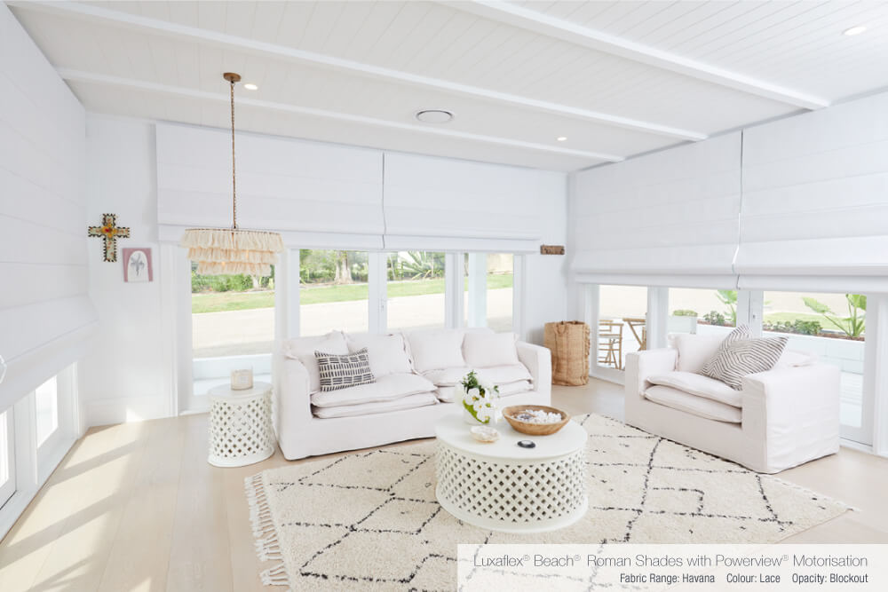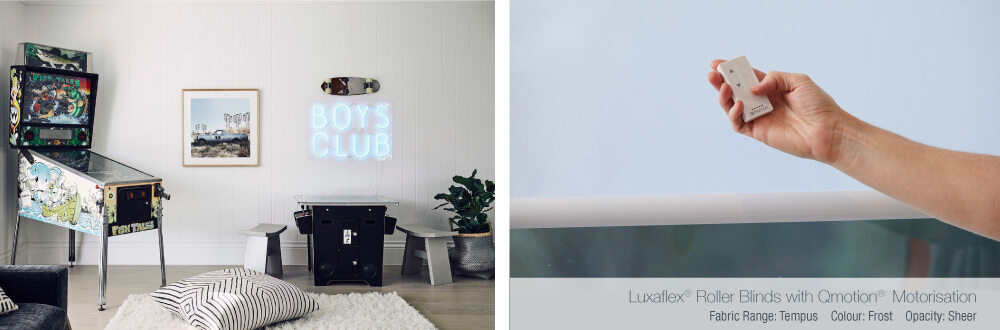 Tucked away from the hustle and bustle of the rest of the house, Bonnie’s adults retreat will serve as the perfect spot for some relaxing quiet time away from the kids. Luxaflex® Roman Shades with PowerView® Motorisation were selected to dress the glass doors in this room. Bonnie was drawn to the large fabric folds of the Roman Blinds as they fit perfectly with her ‘coastal barn’ vision and opted for a crisp white textured fabric, which added a modern touch to the traditional window coverings.