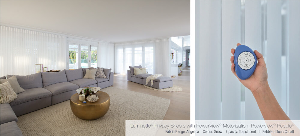 Luxaflex Luminette® Privacy® Sheers with PowerView® Motorisation were used to dress the large stacking doors in the main lounge room. The addition of these elegant blinds help soften the room, providing a stylish means of controlling the light and cutting out the glare, which is particularly handy when watching TV. These motorised Softshades can be simply operated with the touch of a button on either the Pebble remote or via the PowerView app on an iPhone or iPad - they're what Bonnie likes to call ‘the Rolls Royce of Blinds’. As she explains in Superstylin’ the most used room in our house, her Luminette® Privacy Sheers ‘glide open and shut like dream! #notjustaprettyblind’. ck.