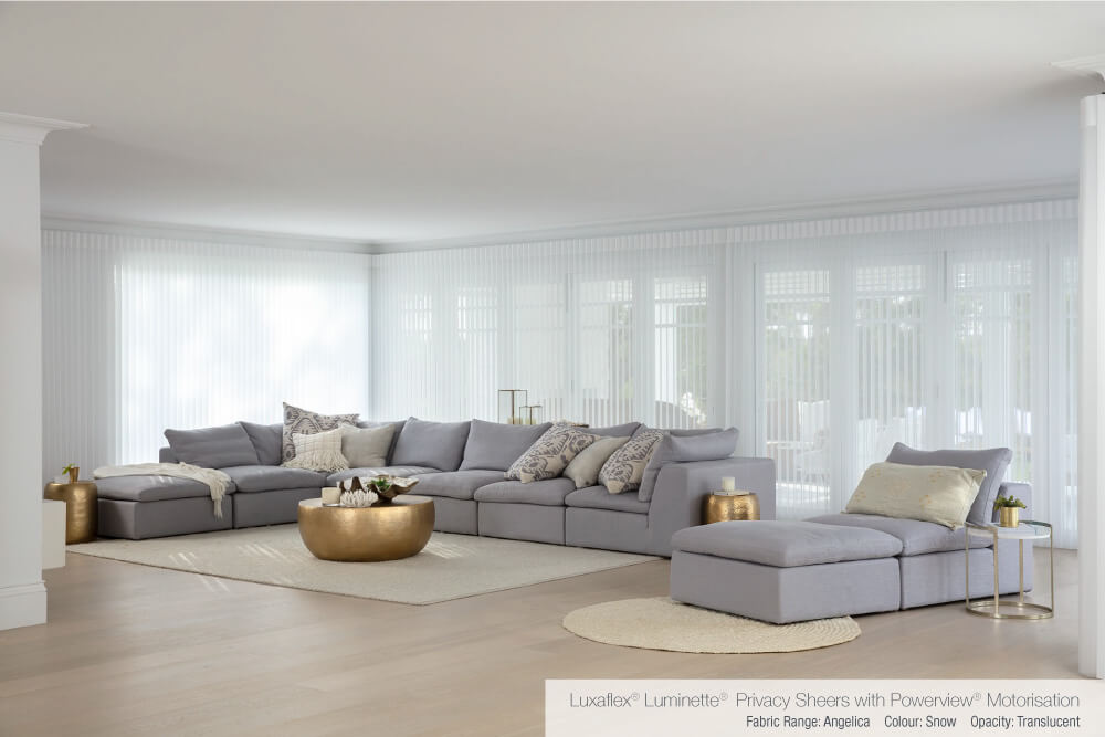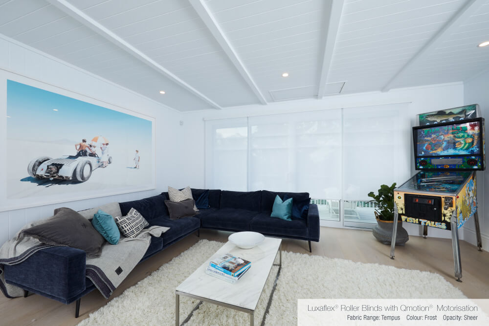 Bonnie opted for sheer Luxaflex® Roller Blinds with Qmotion Technology as they ticked all of the boxes in her brief. The Roller Blinds neatly roll up and off the glass to allow for the sliding doors to be opened, while the sheer fabric helps control the light and cut out the afternoon glare. These blinds would also help combat the cold dark glass at night, and additionally the motorised operation meant that they were completely cord-free and easy to use.