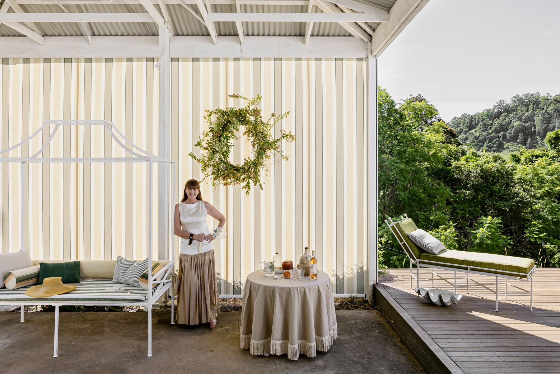 Continuing the use of awnings, Megan explains, “One of my favourite transformations has been the carport, in which we are leaning into our love of portmantaue and calling The PartyPort.” No longer just a carport, the space is a multi-functional outdoor room with incredible airflow, great views and wonderful atmosphere. Powered by the Luxaflex® PowerView® Automation system with motorised blinds, it can instantly transform into a party room, outdoor bar, or entertaining area. Without altering the traditional farmhouse structure, the carport has been elevated to new heights with Luxaflex® Evo Awnings. “I wanted to use the straight drops in the open garage to create a conservatory room, an extension of our living spaces. These were fabricated in Dickson fabric in the colour Hardlot Green - a green and beige stripe reminiscent of old caravan annexes, giving the nostalgic feeling of family holidays.”